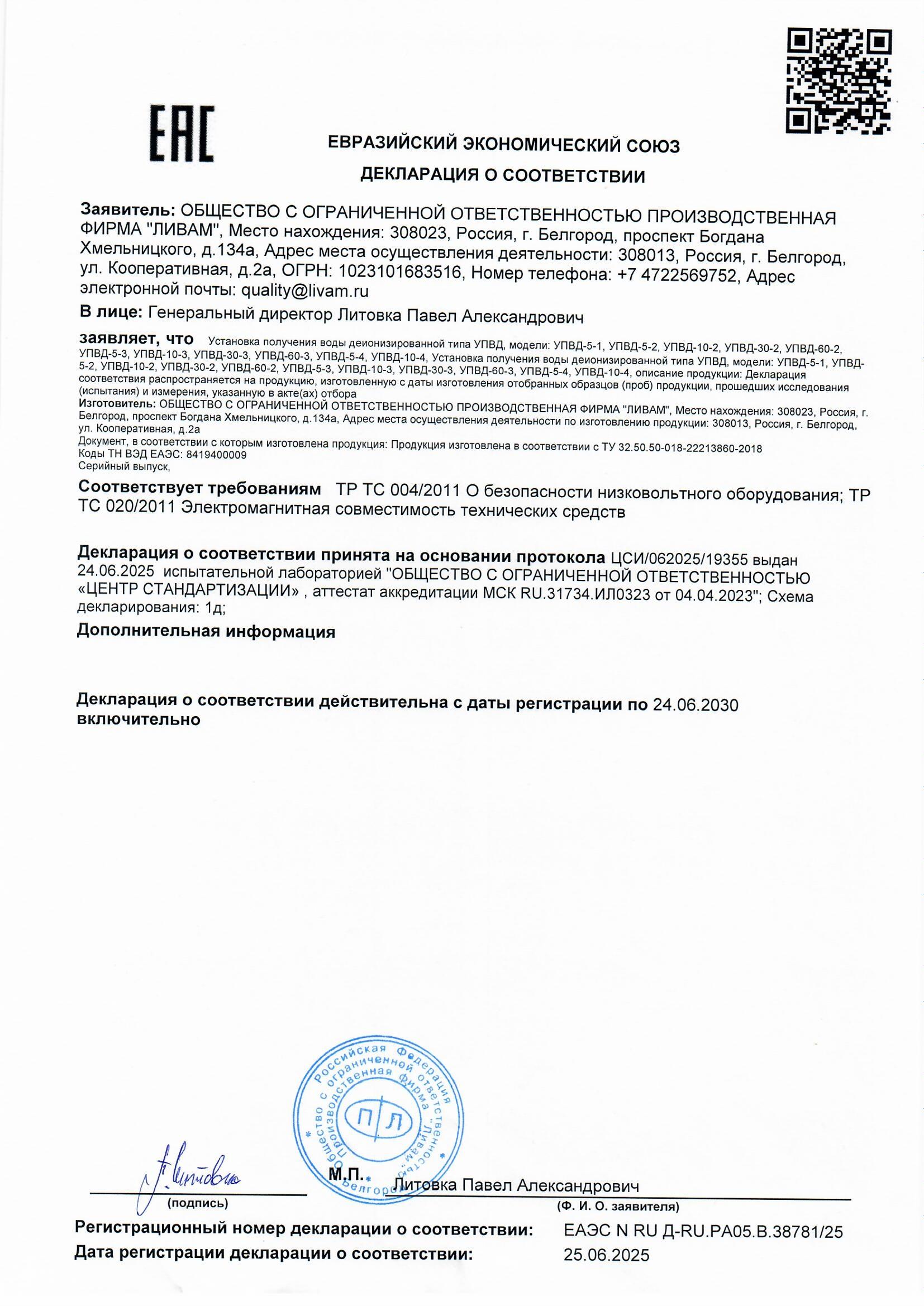 получение деионизированной воды 2 типа согласно ФС 2.2.0020.18 «Вода очищенная», ГОСТ Р 58144-2018 «Вода дистиллированная. Технические условия», ГОСТ 52501-2005 «Вода для лабораторного анализа» |